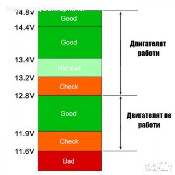 При запален автомобил при работеща система за зареждане напрежението варира между 13.5 V и 14.5 V (при 12 V ел. система) и между 26.0 V - 28.0 V (при