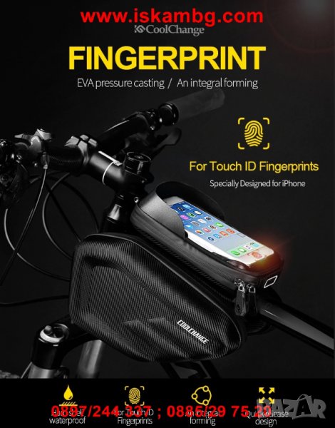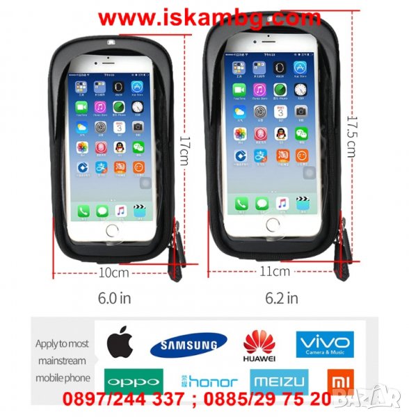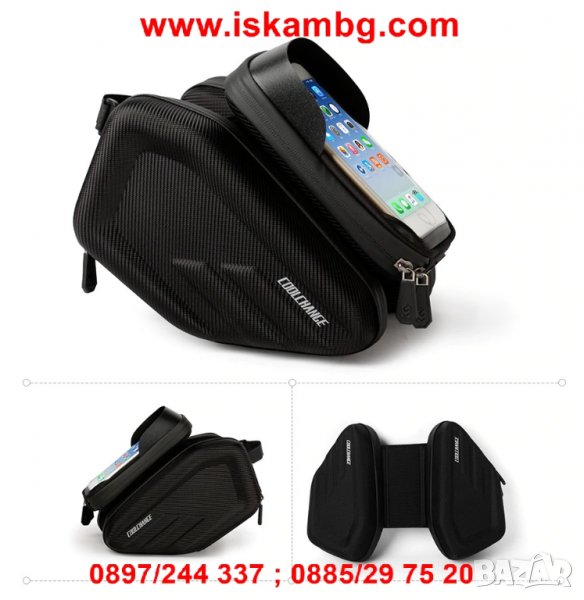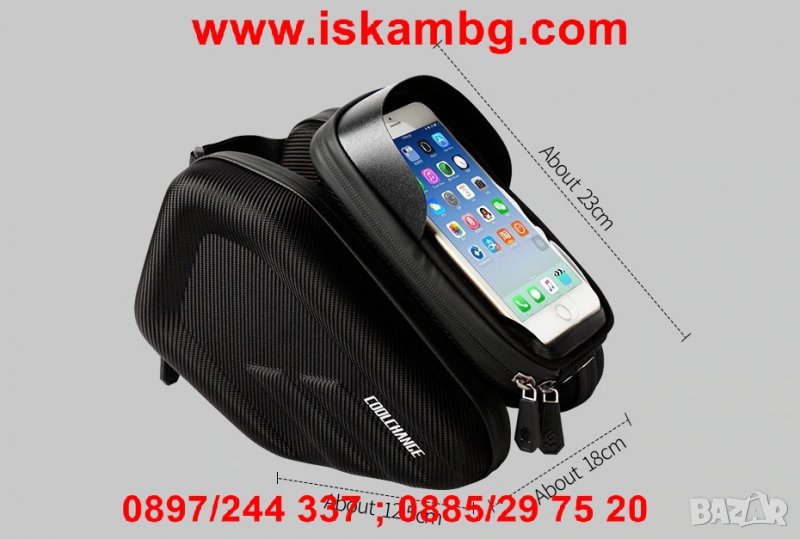 • Горната част представлява джоб от прозрачно найлоново PVC покритие, което позволява по-удобно използване на тъч екрана, докато карате. Предпазва от прах, вода при каране през пресечен терен.