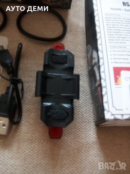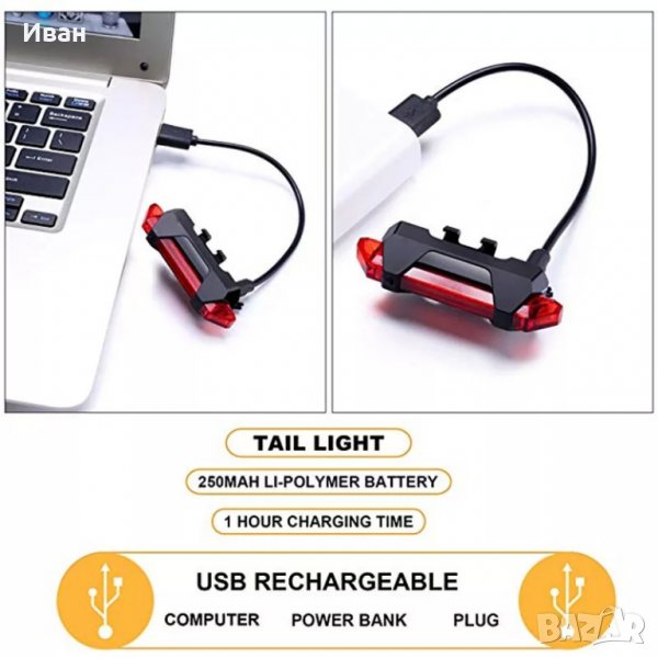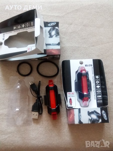 Комплекта съдържа : Лед лампа с вградена батерия за многократно зареждане , кабел за зареждане на лампата ( микро усб / УСБ ) и два броя ластичета за закрепване на лампата за рамката на велосипеда.