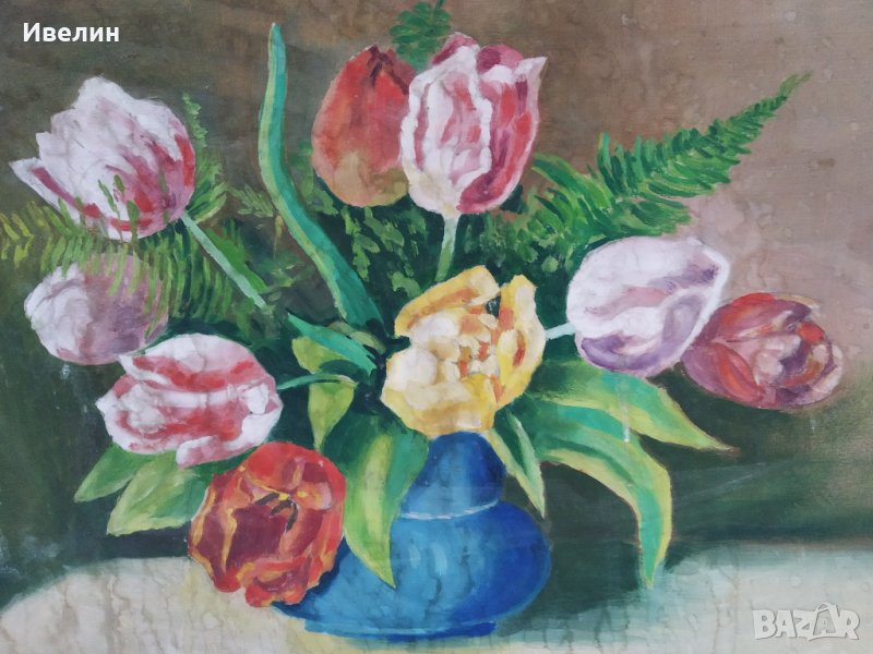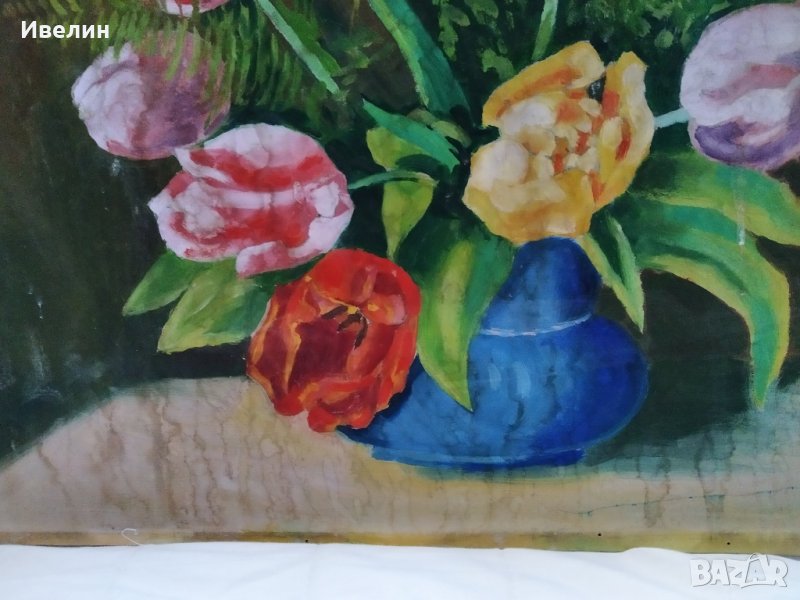 картина-цветя.техника-гваш на картон с размери 37см/50см.състояние видно на снимките.