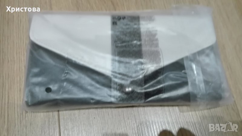 Портмонето е чисто ново, в оригиналната си опаковка. Има ефект на змийска кожа на част от повърхността. Цветът на останалата част е леко кремав, не е чисто бял. Закопчава се с копче. Има вътрешни отделения за карти и монети. Размери: 20,3 х 10,6 см.
