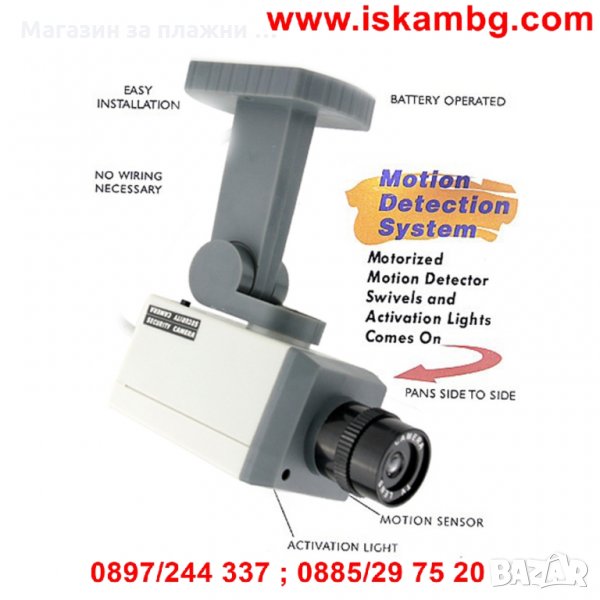 Представяме ви фалшива бутафорна камера активираща се при движение. Перфектна е за помещения, в които се съмнявате, че има възможност от поява на крадци. Тя разполага с червен светлинен диод, който заблуждава крадците за работещо записващо устройство. Когато някой премине в обхват от около 7 метра, датчикът за движение се задейства и камерата започва да сигнализира, като светлинния индикатор започва да премигва.