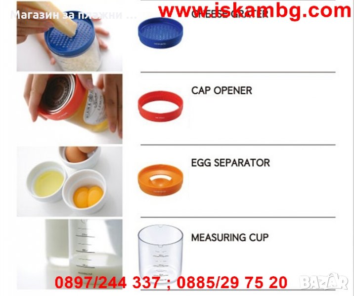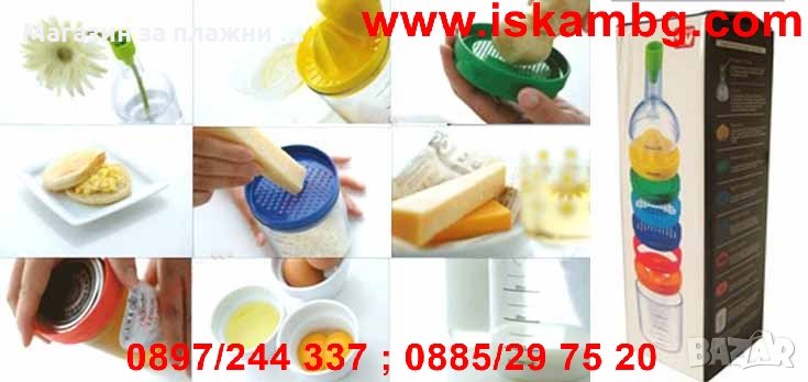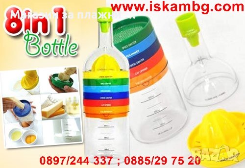 В бутилката има включени осем инструмента, които са идеалните помощници за всяка една кухня. С тези 8 приставки можете да изстисквате сок от любим плод, да режете яйца, да отваряте капачки и още много други неща. Абсолютно всички инструменти можете да ги наредите вертикално под формата на бутилката и така ще си освободите място за други принадлежности в кухнята. Благодарение на перфектния си и стилен дизайн, този артикул се вписва идеално във всеки кухненски интериор. Бутилката е многофункционална и практична и съдържа в себе си нужните приставки, с благодарение на които можете да приготвите вашето любимо ястие. Продуктът е чудесна идея за подарък за нов дом или любим човек, обичащ кулинарията.