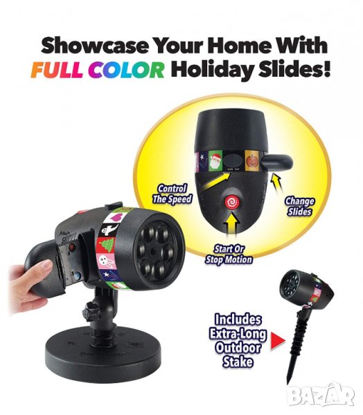 Нека и вашата къща заблести без излишни кабели и усложнения. Просто включете прожектора и го насочете към мястото, което искате да заблести! Устройството ще обсипе в красиви светлинни форми всичко! Сега вече можете да пускате и да спирате движението им с натискане на 1 бутон. Прожектора може да прожектира различни фигури(за хелоуин, коледа и др.). Перфектен както за къща така и за дворове, басейни и всички летни партита. Направете деня си по-приятен с хиляди лампички без никакво усилие. В комплекта има две различни стойки – за вътрешен мотаж или за забиване в почвата.