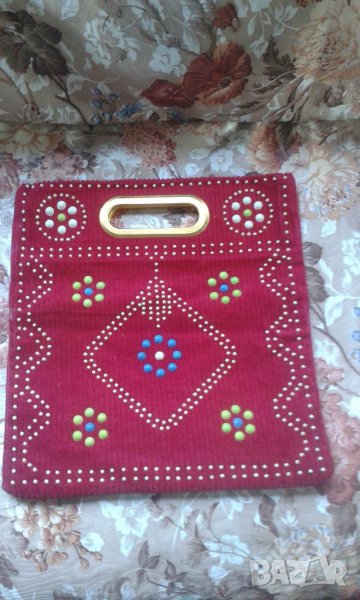 Оригинална руска малка дамска чанта от едро рипсено кадифе с различни красиви фолклорни мотиви от залепени топчета на двете страни на чантата , които и придават ярка индивидуалност. Моделът е с метални дръжки, отвътре е с подплата.Рисунка има и на двете страни.