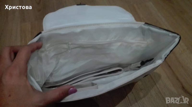 Чантата е в кремаво-бял цвят с ефект на змийска кожа в сиво отпред.