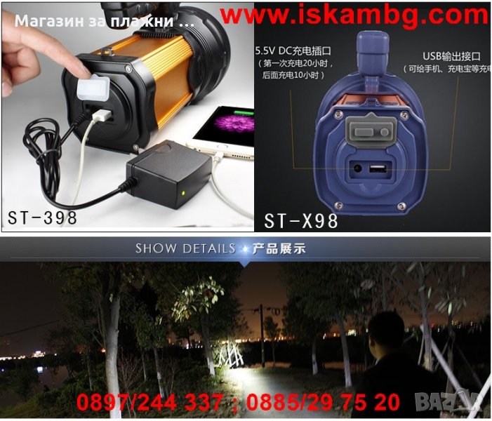 - в комплекта има ремък за пренасяне и зарядно на прожектора за 100-240 VAC (50-60Hz), 0.5mA max, изход - 5.6 VDC, 900 mA;