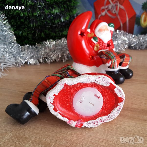 Красива коледна декорация - керамична фигурка, която свети. Фигурка с полумесец, върху който е седнал да си почива Дядо КОледа или Снежко. Изработени от керамика и текстил. Коледният сувениир свети с 3 LR44 батерии, които са включени в комплекта. Предлагат се в 2 варианта.