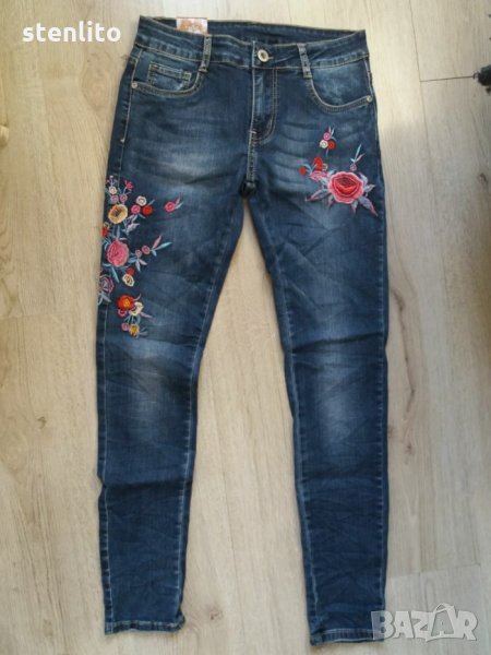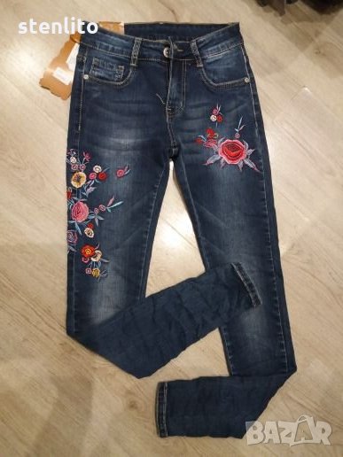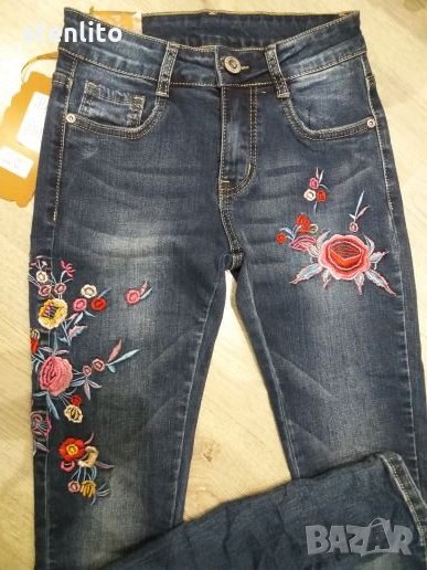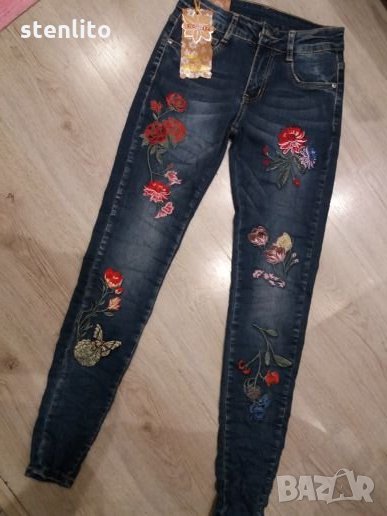 Нови дамски дънки от памучен еластичен деним с цветна бродерия.