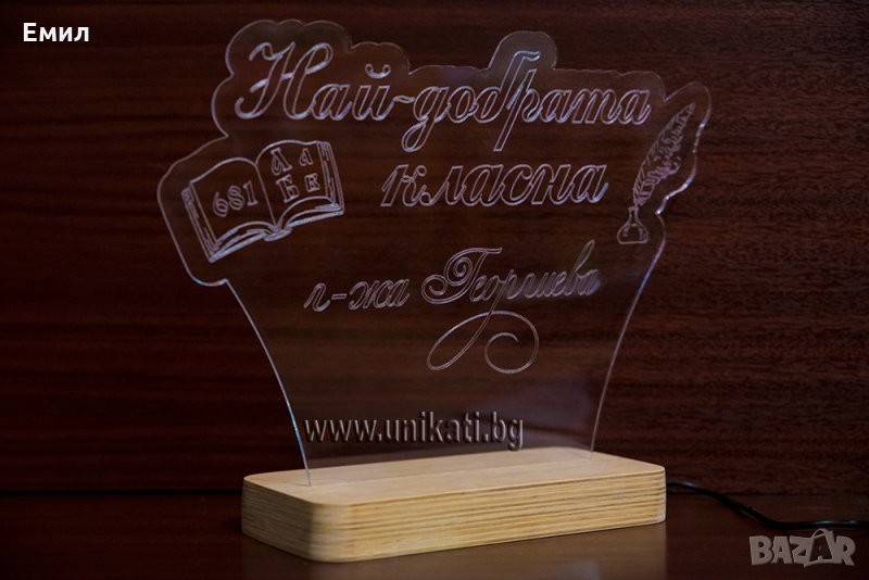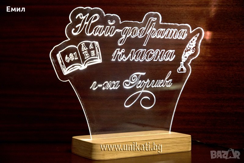 Светеща табела с надпис - Най-добрата класна и гравирано име на класен ръководител. Изработва се само по поръчка и с името на Вашата класна, или класен.
