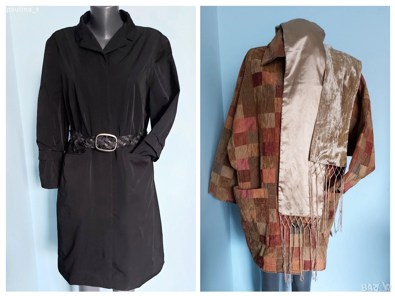 1️⃣. Колаж / L / 2XL - "Gap". Цената е крайна, без пазарлъци 30 евро. Изключително елегантно манто с мои ръчни поправки и атрактивен колан, който влиза в цената. Моделът е обран, съобразено с размера, втален силует с вътрешно закопчаване отпред и на ръкавите. Изработката е на ниво, гарантирана от бранда, поправките на филетките на джобовете и ръкавите са снимани. Материята е еластичен микрофибър с кожен ефект.