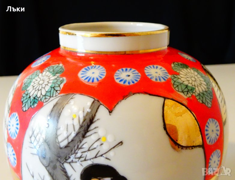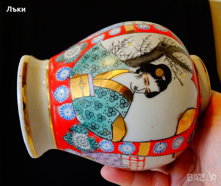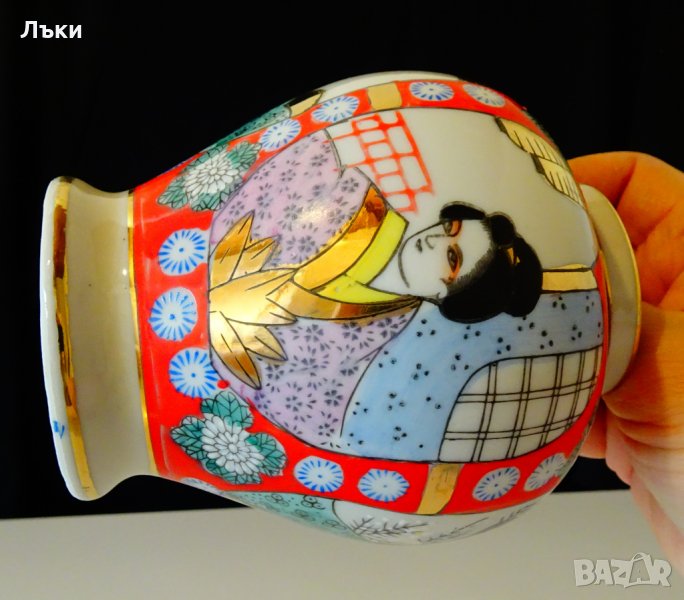 рисувана в стил Сацума с изображения на японки в традиционно облекло,пъстри цветя и много злато 22 карата.Урната е маркирана и датира от 1910 година.Височина 16 см.,диаметър 10 см.,тегло 198 гр.