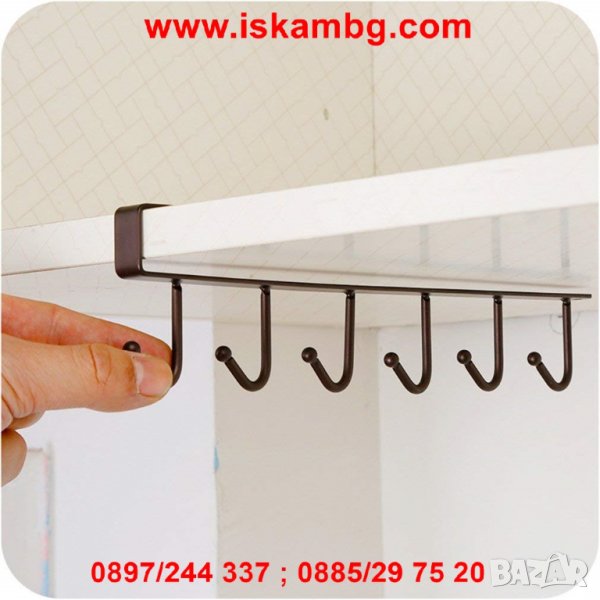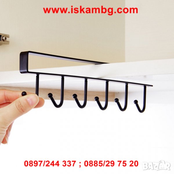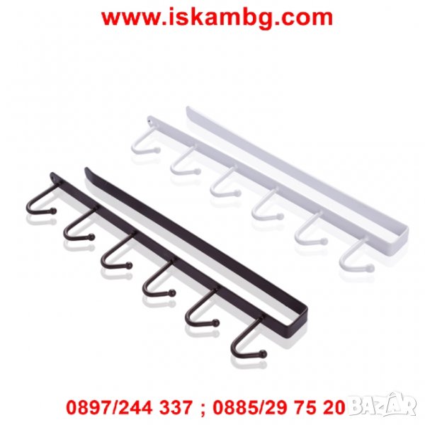 Метална стойка, закачаща се за рафт. Поставка за чаши с дръжка или кухненски прибори. Мултифункционална - използвайте я като органайзер за чаши за кафе или чай, органайзер за кухненски прибори, органайзер за вратовръзки в гардероба, или като органайзер за колани, шалове и други. Стабилно и лесно поставяне. Устойчива конструкция. Закачалката има 6 куки за закачане и се предлага в два цвята - бял и черен.