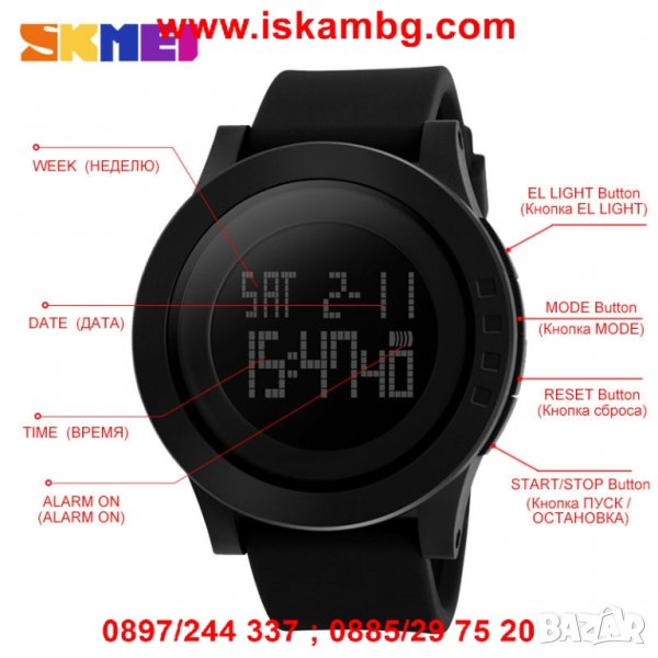 Спортен електронен часовник със силиконова каишка и LED дисплей. Корпусът е силиконов, стъклото на часовника е Hardlex. Технически параметри: