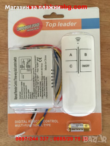 Модул с 3 канала за управление на 220V. Устройството се състои от приемник (блок, който може да се монтира на полилей или другаде) и предавател-дистанционно за контрол на 3 канала + бутон за включване и изключване едновременно на трите канала + бутон изключване след 15 секунди.