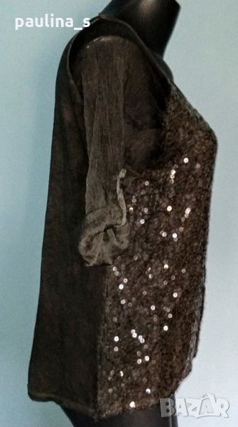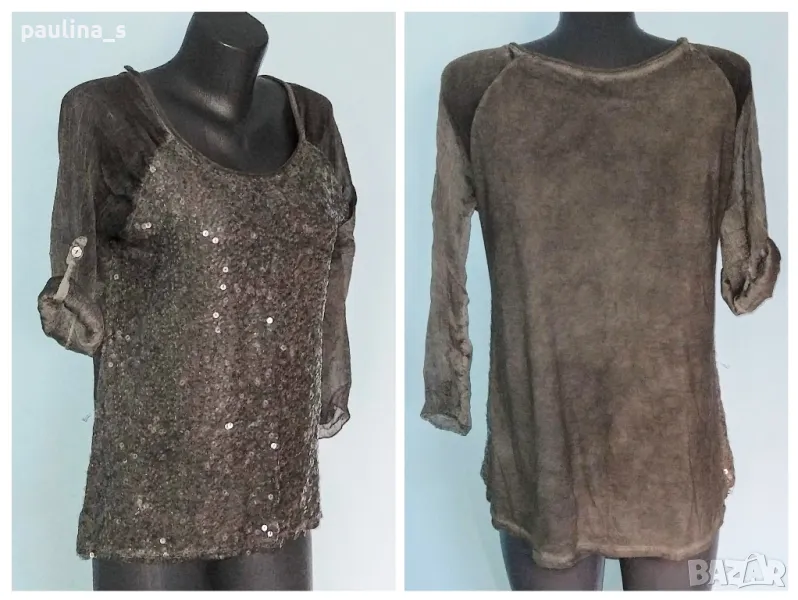 1️⃣ . Колаж / L / XL / Italy. Цената е крайна 29,99лв / 15 евро. Сива! Много красива блуза с декорации от прозрачни пайети. Ръкавите са коприна и се регулират, отзад е памучно трико и дава еластичност. Без забележки, не е носена.