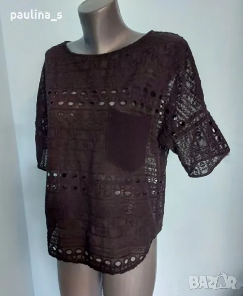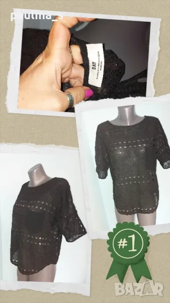 2️⃣. Колаж / L / XL / "Day" by Briger et Mikkelsen. Цената е крайна 19,99лв / 10 евро. Блуза тип туника от бродирана коприна. Моделът е кроп с падащи рамене и отворен външен джоб за декорация. Заоблени долни части, без еластичност. Като нова, една бройка, без дефекти и етикет.