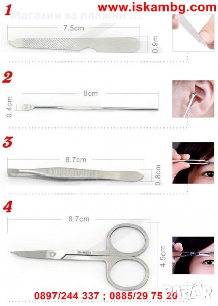 Комплектът съдържа: 3 x нокторезачка; 1 x ножичка за нокти; 1 х пинсета; 4 х части за маникюр; 1 х клещи за кожички; 1 х пила;