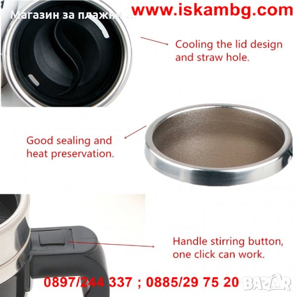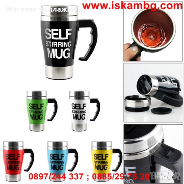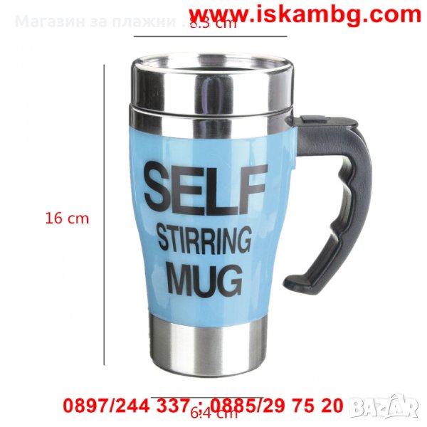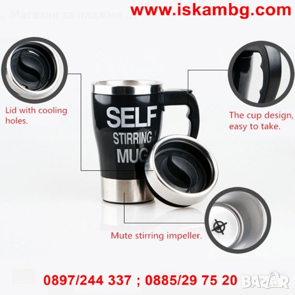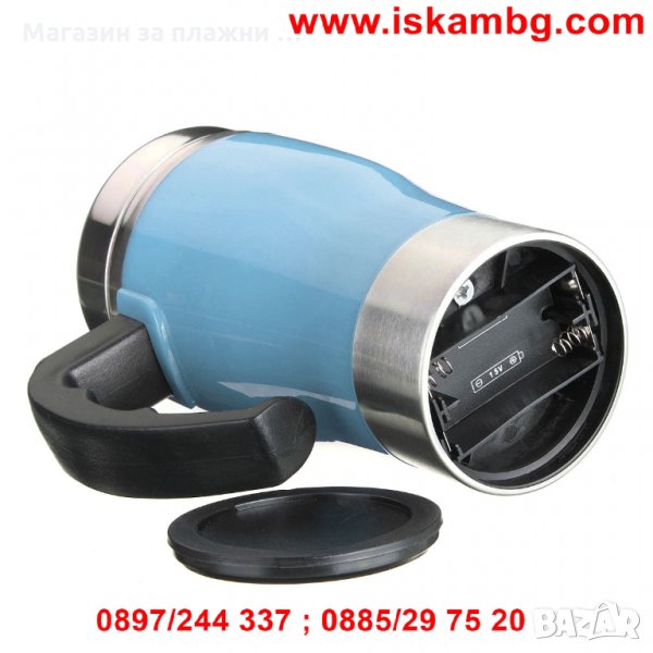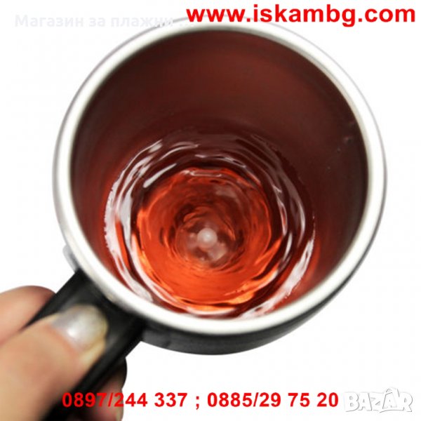 Уникално проектирана термо чаша, която сама си разбърква така жадуваното сутрешно кафе – само със захар или и с голяма доза мляко. Идеалната чаша за всички постоянно търсещи с какво да си разбъркат топлата напитка, за нетърпящи досадното бъркане с лъжичка, за тези които мразят да мият лъжички или за тези, които не понасят тракането им по стените. Специално монтираната на дъното на чашата перка, включвана от почти незабележимо копче на дръжката й решава тотално проблема с разбъркването. Чашата има и капак с отвор за пиене когато например сте на път с автомобила и се притеснявате да не разлеете напитката си. Капака има качествено силиконово уплътнение, което плътно затваря чашата. Сипете, разбъркайте само с натискане на едно копче и изпийте с удоволствие чаша горещо, освежаващо кафе!!!