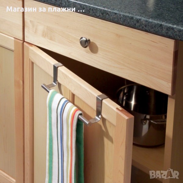 Закачалката за кърпи е предназначена за монтаж върху вратичката на кухненските шкафове. Изработена от хромникелов материал, тя е много здрава, неръждаема и влаго устойчива. С елегантен дизайн, без остри ръбове, поставката ще бъде красиво и функционално допълнение към кухненската ви мебелировка.