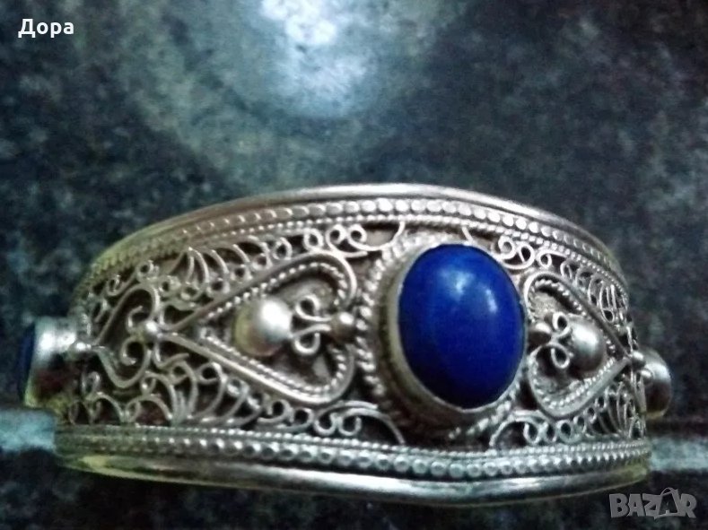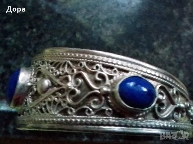 Уникат от сребро стара европейска ръчна изработка. Техника наложен филигран и вградени естествени камъни Лазурит. Поставен е печат, който трябва да се види с много силна лупа дали е глава на лъв или Горгона, за да се изясни произхода. Висока проба на сребро, над 900.Тествана от златар. Отворена, на снимката е 6 см.. Ширината отпред е 2,5 см.. Тегло 37, 30 грама. Просто невероятно красива на живо и в отличено състояние. Бижу за ценители. Цената е крайна.