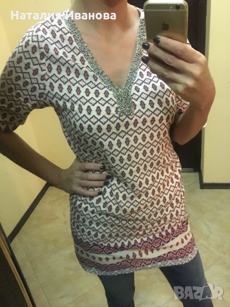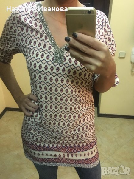 Продавам дамска блуза с три- четвърт ръкав и зашити камъни около денолтето. Блузата е в отлично състояние и няма забележки по нея. Материята не се мачка . Блузата не се разменя за друга стока.