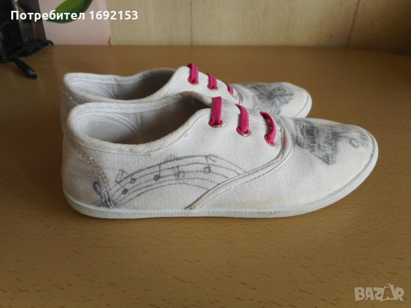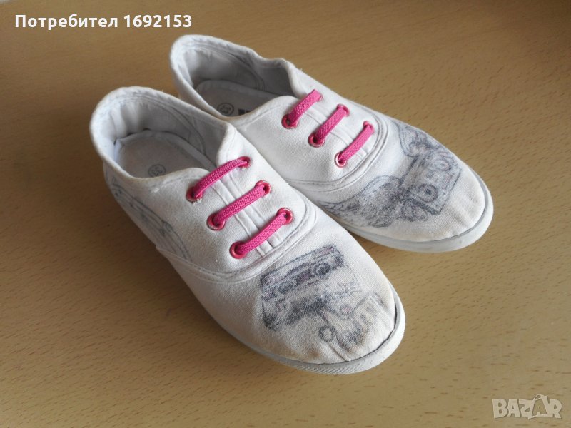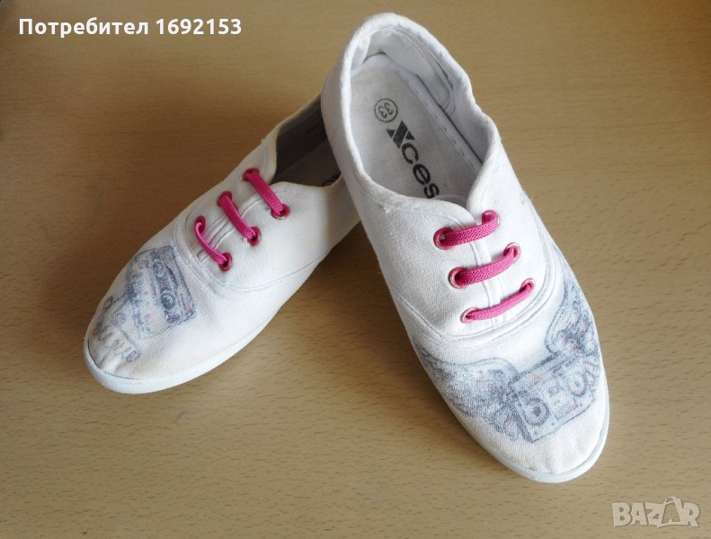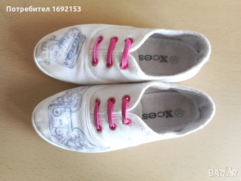 Рисувани гуменки Xcess №33 със стелка 21 см. Много леки и удобни са. Връзките са ластик и затова обуването е много лесно. Ползвани са преди всичко за физическо. Прани са.