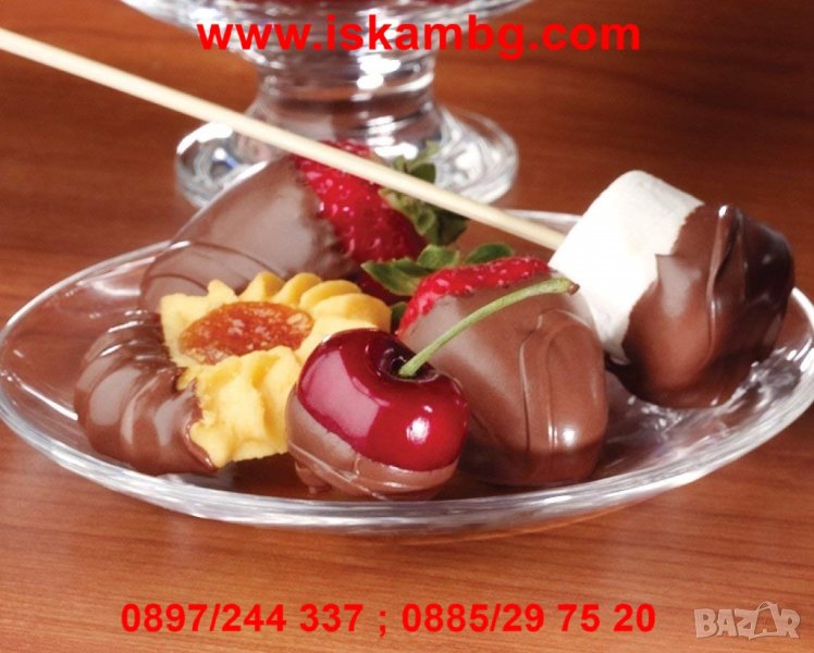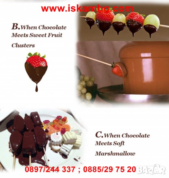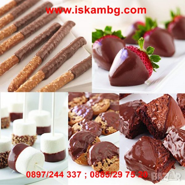 Можете да потопите ягоди, бонбони, ябълки, бисквити, соленки, топки сладолед, охладено фъстъчено масло и всичко което ви дойде на ум в комбинация с течащ шоколад.