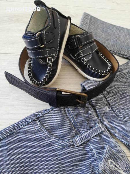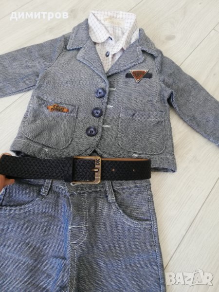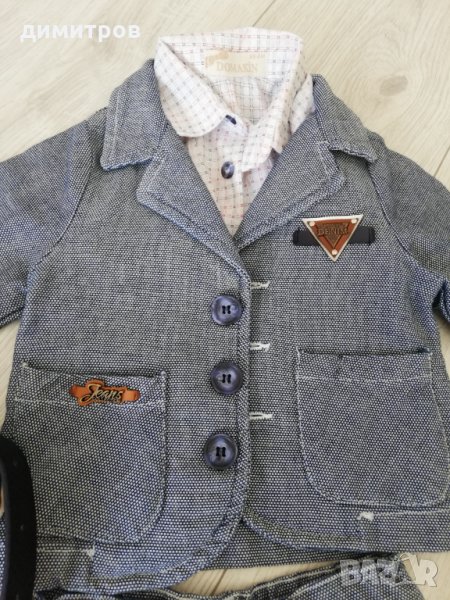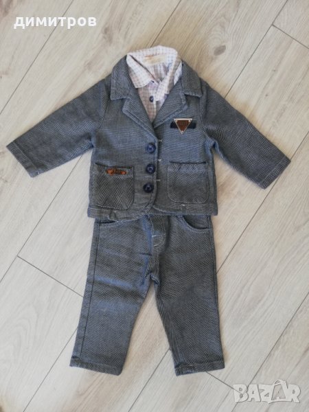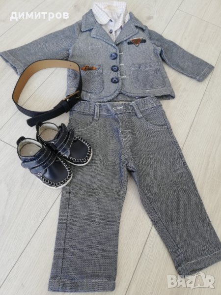 Официален костюм Деним 6-9м от две части и риза, към него подарък обувки и колан. Всичко обличано веднъж за кръщене, с обувките не е ходене изобщо и всичко е неразличимо от ново!!! 0885594662