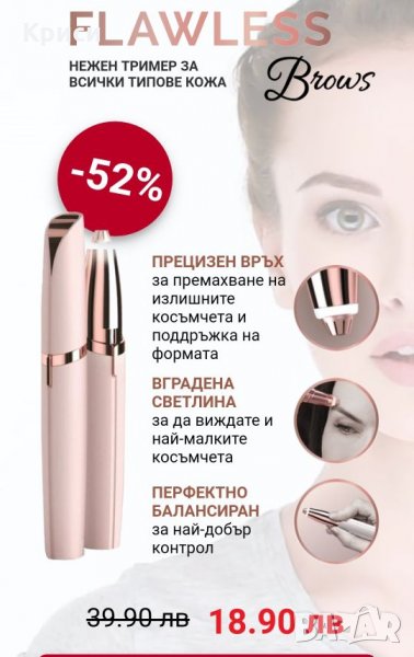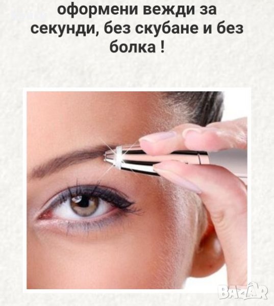 Компактен дамски тример за оформяне на вежди Flawless Brows, чрез който получавате идеално оформени вежди за секунди, без скубане, без болка и без да остават излишни косъмчета, създаващи дискомфорт. Този тример е удобен, компактен, елементарен за използване и ще ви спести време, а защо не и пари от козметични салони! Прецизният му връх позволява точно и лесно създаване на идеалната форма на вашите вежди, а вградената светлина насочва и чрез нея виждате и най-малките косъмчета. Удобен е за хващане и нежен към всички типове кожа, като не я раздразва. Компактната му форма позволява да го носите навсякъде със себе си – на работа, по време на пътуване и тнт…