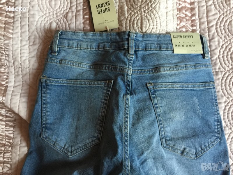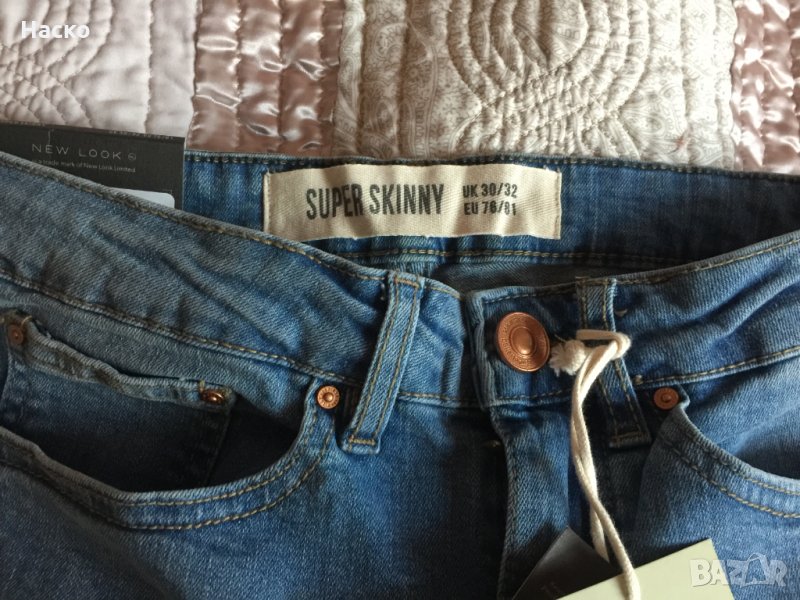 new look размер 30 за талия 76см, на дължина са около 100см стреч материя по крака. YKK ципове, джинсите са качествени и нямат нищо общо с китайските ментета на пазара.Дават се само за 20лв поръчахме ги по интернет от чужбина но се оказаха грешен номер.