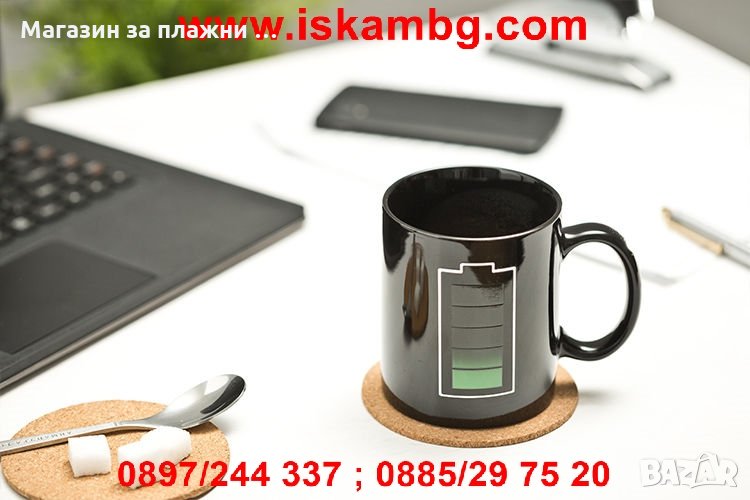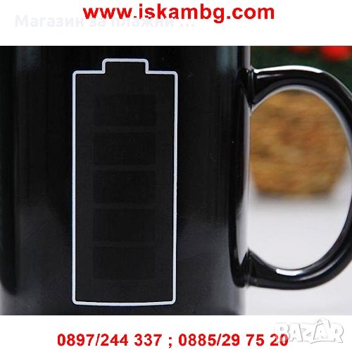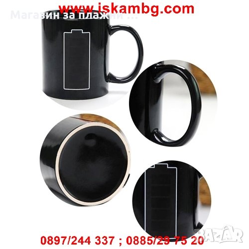 Магическа чаша за чай е забавна и перфектна за подарък.Красива, магическа, порцеланова чаша за топли напитки, която си променя цвета след като се налее топла течност. Моделът е произведен от висококачествен порцелан в бял цвят, който е идеална основа за принт на черна батерия, която си променя цвета в зелен.Интересен акцент на бюрото в офиса, или на кухненския плот в дома. Чашата е подходяща за сервиране на чай, кафе и други горещи напитки и е страхотно решение за създаване на настроение.