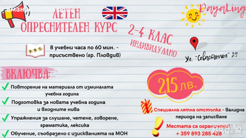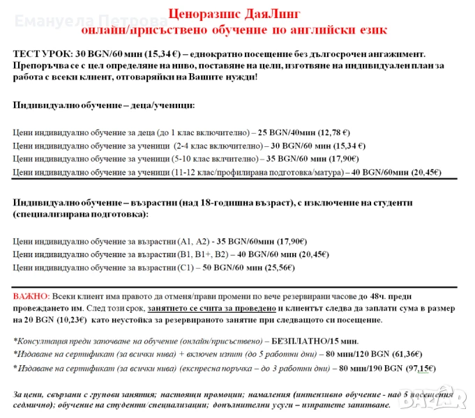 НА АНГЛИЙСКИ ЕЗИК! Уроците в образователен център ДаяЛинг (онлайн/присъствено) се случват САМО с предварително записан час в удобно и съобразено с нас и Вас време (ден, час). Цената