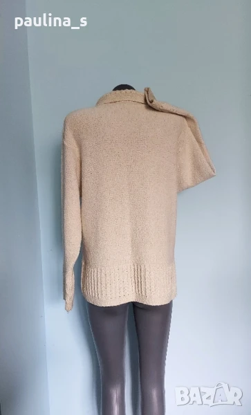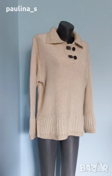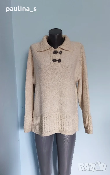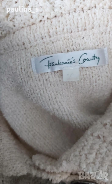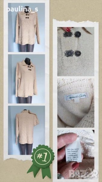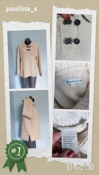 2️⃣. Колаж / XL / 3XL Цената е крайна 49,99лв / 25 евро. Туника с метални орнаментирани закопчалки, акцентът на дрехата. Преждата е доста плътна, букле от памук, лен и полиамид, в страни има цепки, обазовъчна линия плетиво, голям размер! Без дефекти, една бройка, като нова.