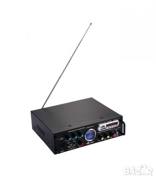 Домашен усилвател с Мp3, USB, SD, FM РАДИО с ДИСТАНЦИОННО управление и КАРАОКЕ функция. Блутут връзка към компютър, таблет и телефон. Технически характеристики: МР3 плейър, Слот за USB флашка, Слот за Micro SD карта памет, Блутут, Вход за 2 Микрофона, Настройка на ехо и еквалайзер за честотите за микрофоните, Радио FM честоти: 87,5MHz - 108MHz, Максимална консумирана мощност: 80W, Честотен обхват: 20Hz-20KHz, Контрол на високи: 12dB ± 10KHz, Контрол на басите: 12dB ± 10KHz, Захранване: 220V-240V, Размери: 25.5 х 25 х 7,5 см. Внимание!!! Усилвателя е за домашни цели.