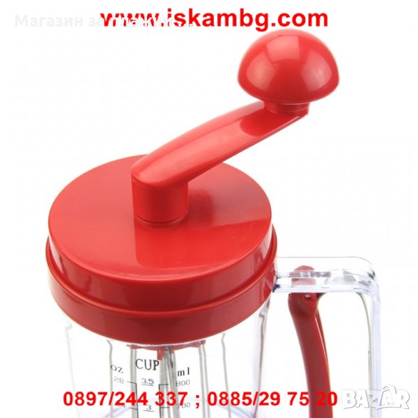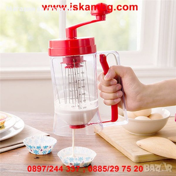 Подгответе сместа и я поставете в каната,с помощта на дръжката на капака разбъркайте до получаване на хомогенна смес и със специалния спусък,може лесно да пропускате нужното количество смес направо върху тигана.