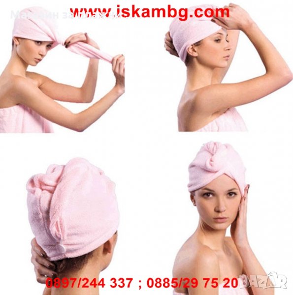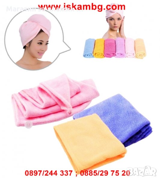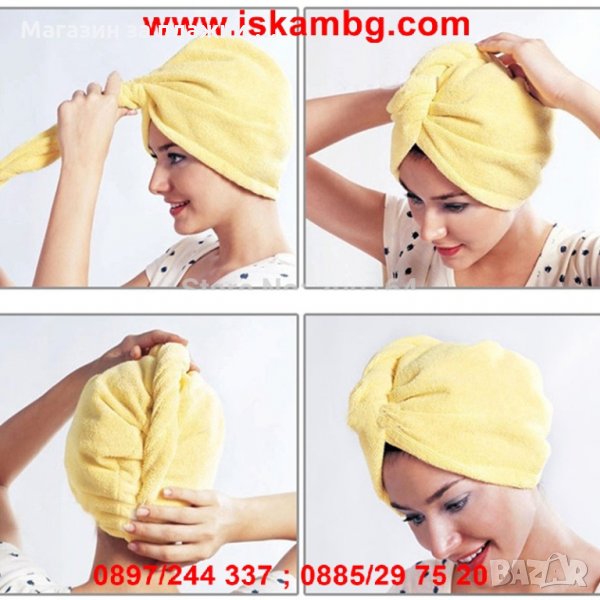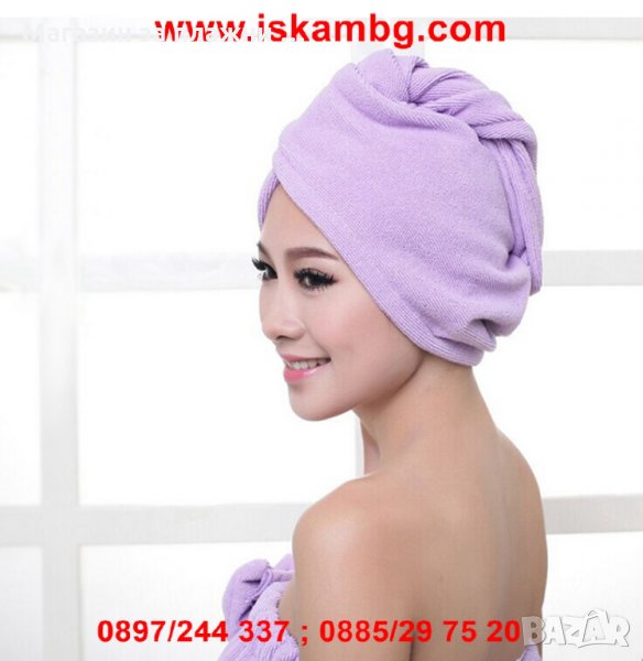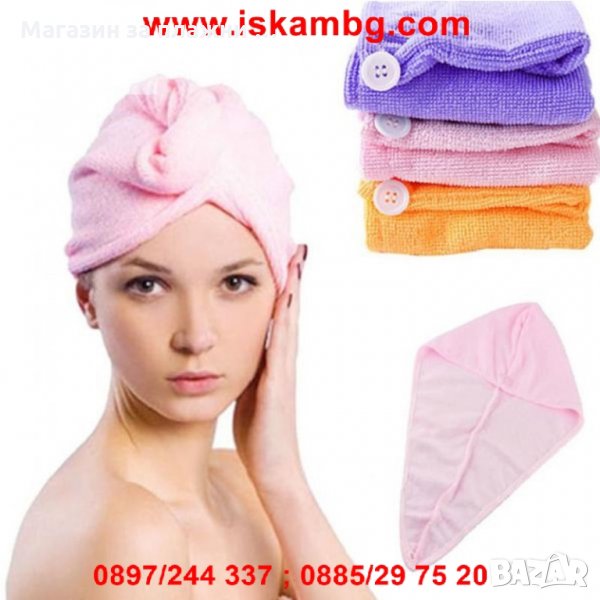 Мека микрофибърна кърпа, специално създадена за неагресивно подсушаване на косата. Благодарение на формата си и наличието на копче кърпата остава стабилно увита около косата. С нея ще подсушите косата си бързо и лесно, избягвайки вредите от дългото ползване на сешоар. Кърпата-шапка е лека и удобна за носене и абсорбира 7 пъти повече вода от нормалните кърпи. Може да се използва от жени и мъже както с къси, така и с дълги коси /до 45-50 см/.