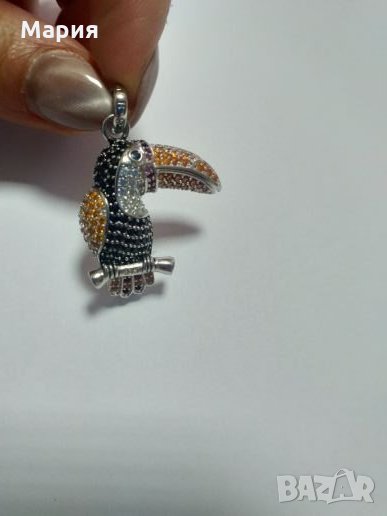 Разкошен сребърен тукан (масивна висулка) с инкрустирани полускъпоценни камъни. Проба на среброто 925. Висулката е унисекс, тегло около 7 гр.
