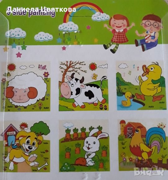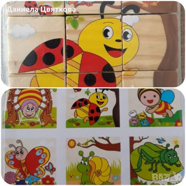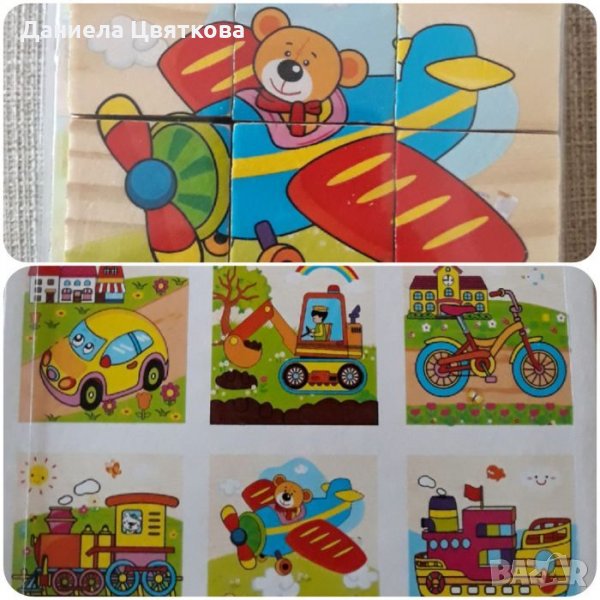 Детски дървен пъзел с кубчета. Всеки пъзел се състои от девет кубчета, които могат да се подредят в шест различни картинки.Всяко кубче е с размер малко над 3 см. В сглобен вид, пъзела е с размер 10 х 10 см.