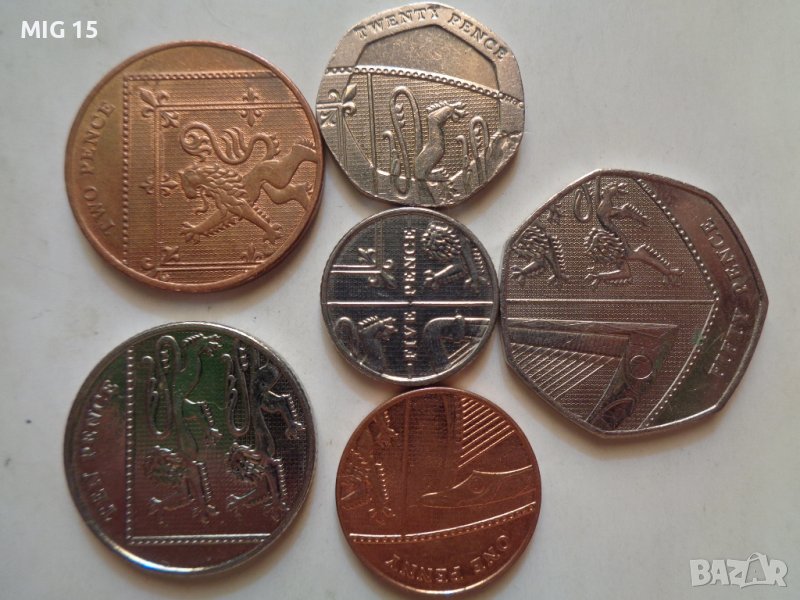 Продавам 6 британски монети : 1 пени , 2 пенса , 5 пенса , 10 пенса , 20 пенса , и 50 пенса. Всяка от монетите съдържа фрагмент от герба на Обединеното кралство (Великобритания). Подреждат се като пъзел и образуват герба.