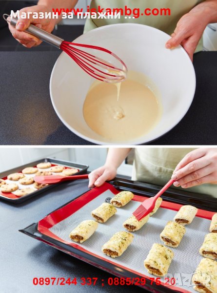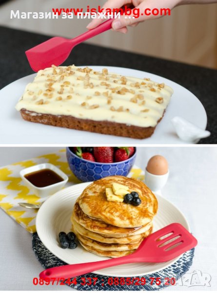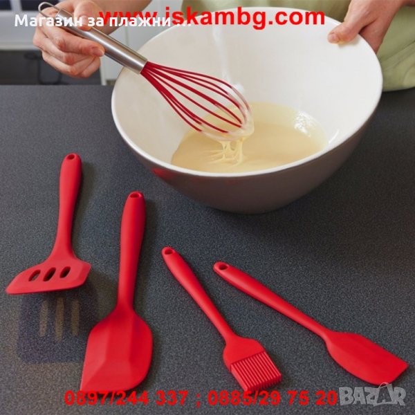 Комплекта включва: Силиконова яйцеразбивачка, силиконова четка, силиконова решетъчна лъжица и малка и голяма силиконова шпатула
