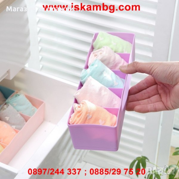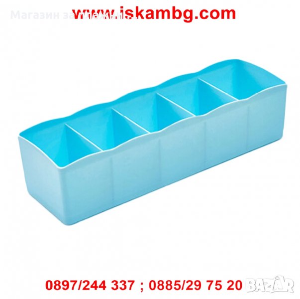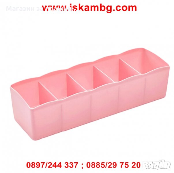 Практичен органайзер, с който шкафовете ичекмеджетата ви ще бъдат изрядно подредени а вашите неща ще бъдат видими ивинаги на разположение. Органайзерите са с 5 отделения , в които можете данаредите различни вещи като козметика, бижута, лекарства, бельо, чорапи и др. Взависимост от вашия шкаф, може да сложите няколко органайзера подреденивертикално или хоризонтално.