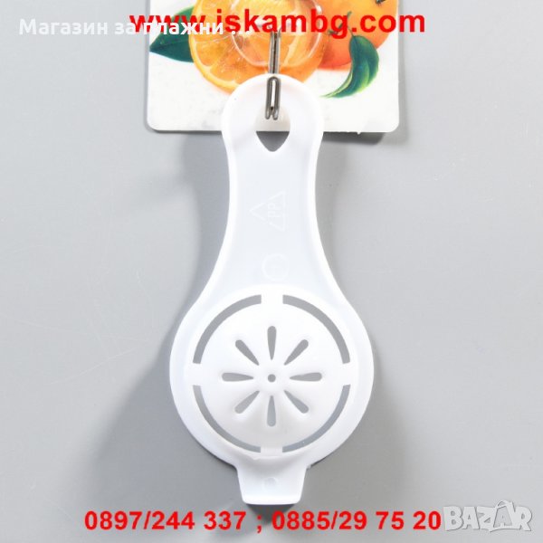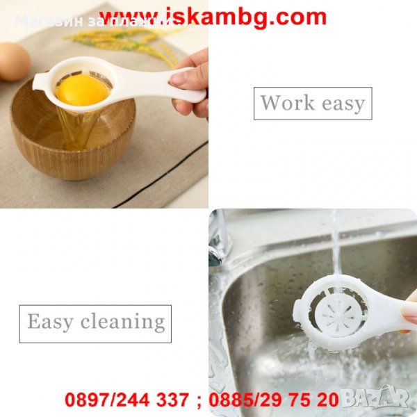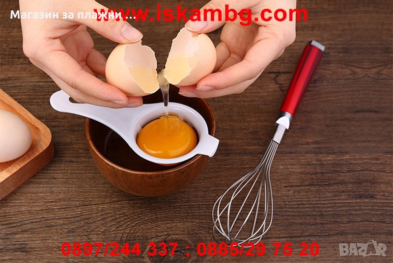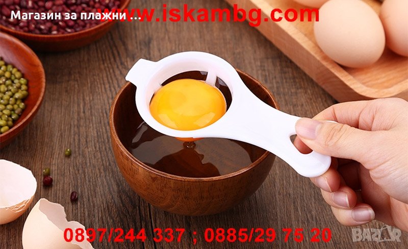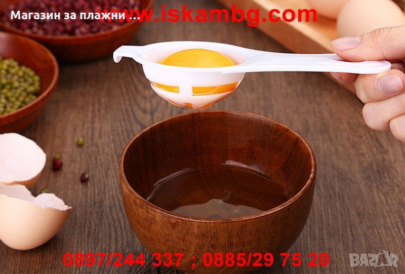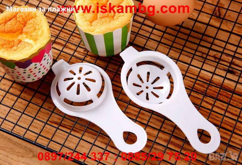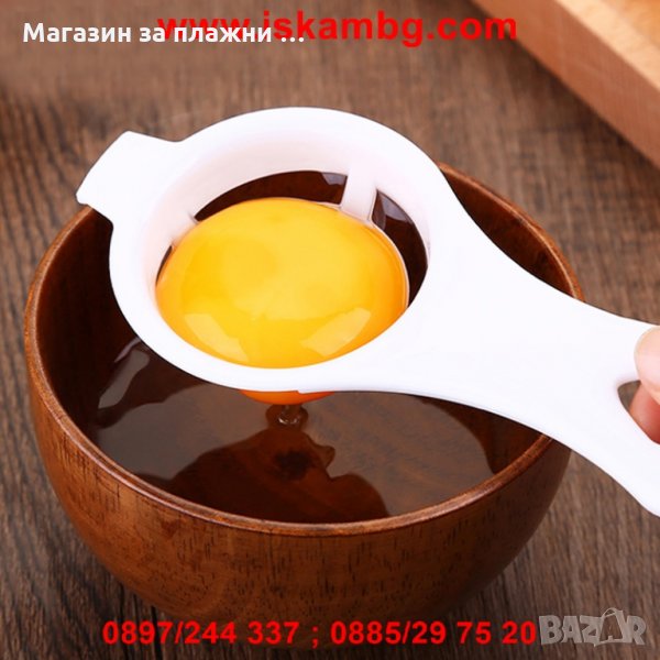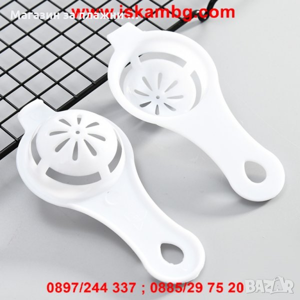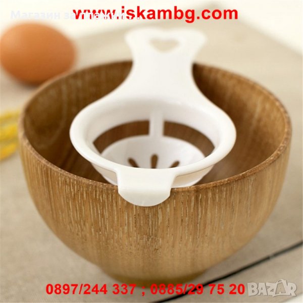 Малък прибор за лесно разделяне на белтъци и жълтъци. Цедка за разделяне на жълтъка от белтъка на яйце с пригодена кука за закачане на съд, за да може и двете ръце да са свободни. Супер лесно и просто отделяне на белтъка от яйцето. Практичен и нужен прибор за всяка кухня.