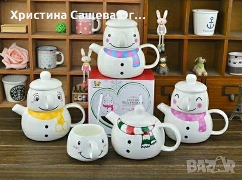 Весел и забавен порцеланов комплект за чай или кафе от 3 части под формата на Снежен човек с шалче - чашка,чайниче и капаче.
