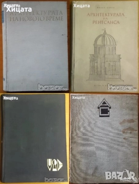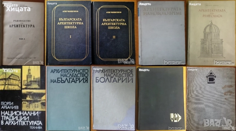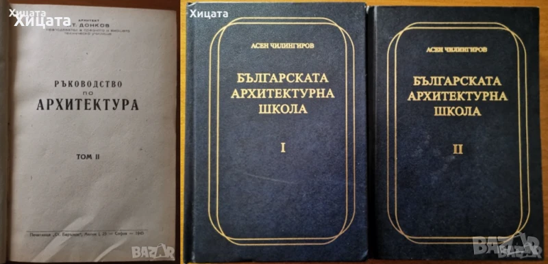 Ръководство по архитектура.Том 2,Атанас Донков,Печатница Ст.Баръмов 1945г.,464стр.Изключително запазена! 300лв. Българската архитектурна школа,Том 1-2,Асен Чилингиров,2007г.684стр.Отлични с леки забележки! - 240лв. Архитектурното наследство на България,Техника,1972г.328стр.- 100лв. Национални традиции в архитектурата,Георги Арбалиев,Техника,1982г.320стр. 130лв. Архитектурни скици и рисунки,Пантелей Цветков,Наука и изкуство,1956г.144стр.Отлично книжно тяло,забележки по корицата. - 100лв Строителни и художествени традиции на българската архитектура,Георги Арбалиев,Техника,1977г.440стр.Отлична със забележки по обложката! - 120лв Архитектурное наследство Болгарии / Архитектурното наследство на България ,Техника,1972г.327стр.Разгледани са 115 основни български архитектурни забележителности. Целия албум е изпълнен с снимки и схеми. Отлично книжно тяло,здрава корица със забележки. - 80лв Изобразителни похвати в архитектурата,Дориан Морозов,Техника,1958г.262стр. - 100лв Наръчник по архитектурно строителство,Д.Баждаров,Л.Попдонев и др.Техника,1971г.764стр.Забележки по корицата. - 90лв. Архитектурата на Ренесанса.В Италия и в другите западноевропейски страни,Милко Бичев,Наука и изкуство,1954г.304стр. - 100лв. Архитектурата на новото време XVII-XVIII век.Барок - Рококо - Класицизъм,Милко Бичев,Техника,1958г.578стр. - 100лв. Класически архитектурни форми,Иван Попов,Мила Иванова,Техника,1962г.Албум с папка,266стр.(122стр.+144стр.)Отлично книжно тяло,забележки по корицата. - 150лв. Класически архитектурни форми,Иван Попов,Мила Иванова,Техника,1976г.260стр. - 150лв. Тектоника и конструкции на архитектурното наследство в България,Храбър Попов,Техника,1972г.184стр. - 70лв Рилският манастир.История.Архитектура.Резби.Стенописи,Христо Христов,Георги Стойков,Кръстю Миятев,БАН,1957г.320стр.Албум Голям формат! Изключително запазен! - 200лв Mural ornaments from south-west Bulgaria,Zahari Dimitrov,Boris Sharov,Bulgarian Academy of Sciences,1965г.200стр.Български и Английски Език - 200лв.,Захари Димитров,Борис Шаров БАН,1964г.200стр.117бр.Репродукции! Само Български език -200лв.Българската архитектура през вековете,Техника,1982г.334стр.Меки корици - 120лв Речник на селищата и селищните имена в България 1878-1987,Н.Мичев,П.Коледаров,Наука и изкуство,1989г.306стр. - 70лв Краткая история болгарской архитектуры,БАН,1969г.648стр.Отлична с леки забележки! - 90лв Болгарская средневековая культура,Издательство литературы на иностранных языках,1964г.144стр.Отлична! - 50лв Болгария,Христо Буковски,Борина,2004г.192стр.Отлична!Руски език! - 50лв