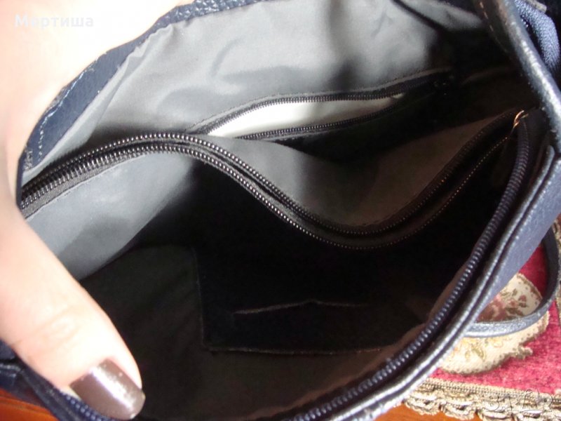 Синя италианска чанта може да се носи и като раница ( от по дебелата кожа е ) Размер 26 на 30 см основа широка 10 см .С три основни отделения и такива за документи и телефон ,заден джоб .Като нова е слагана е 4,5 пъти На съобщения за пазарлъци и бартери не отговарям .