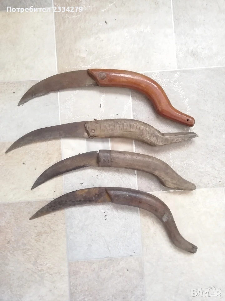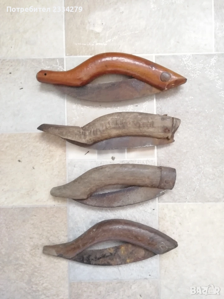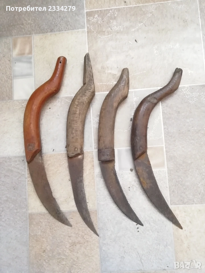 Стари антични овощарски триони.могат да се използват. Идеална колекция за битов кът в механа,двор,стара къща. N:2 четири броя завани, лозарски триончета сгъваеми ръчно изработени в различни години, 100% автентичност, цена 5€. за брой.