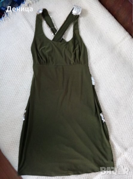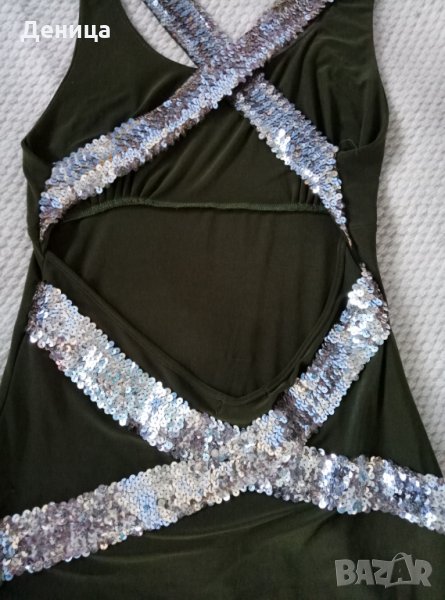Роклята е много ефектна, с гол груб и кръстосани презрамки с пайети. Оторед има съвсем леко раздърпан конец. По етикет е Л раЗмер, но отговаря на М.