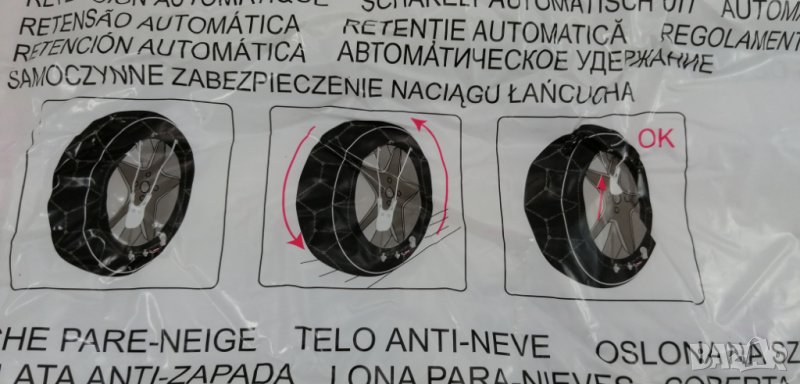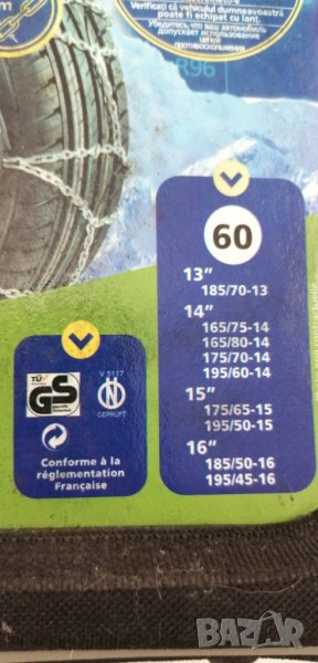 вериги за сняг Norauto 60, нови, френски, внос от Франция. На снимките има посочени размерите на гумите, за които са подходящи. Комплектут съдържа и предпазно покривало против замръзване за редно стъкло.