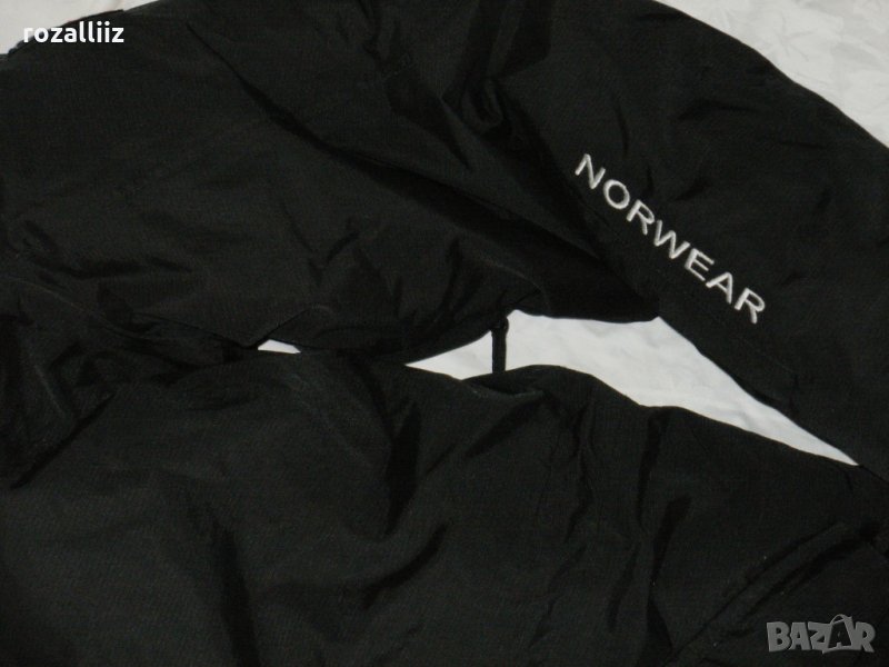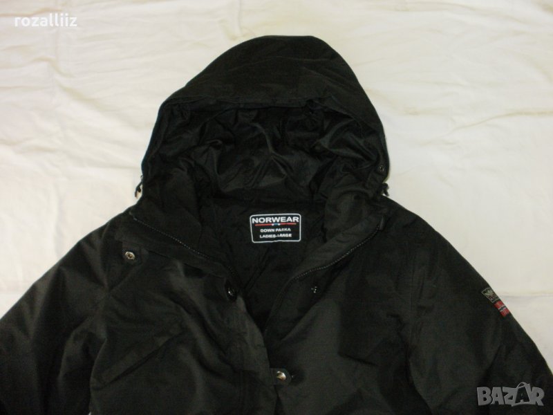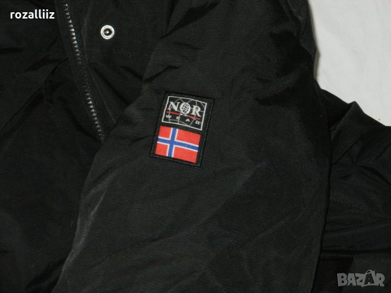 Якето е на NORWEAR, оригинално, облично е, но е като ново, без забележки. Само пухчето на качулката липсва. Цвета е наситено черно. Става за спорт и за града. Пълнежа е дебел слой гъши пух, материята не пропуска дъжд вятър, шевовете са шити и лепени. По номер е L, вталена кройка е. Закопчава се със стабилен двоен цип и отгоре с капси. Отпред има три джоба с ципове, един на ръкава. Вътре има още два джоба. Отпред е по късо. Подмишниците има отдушници с ципове. На качулката, на талията и долу има ластик със стопери. На ръкава долу има трикотажно бие и отгоре с лепка се прибира плътно. Якето е много дебело и топло, за голям студ.